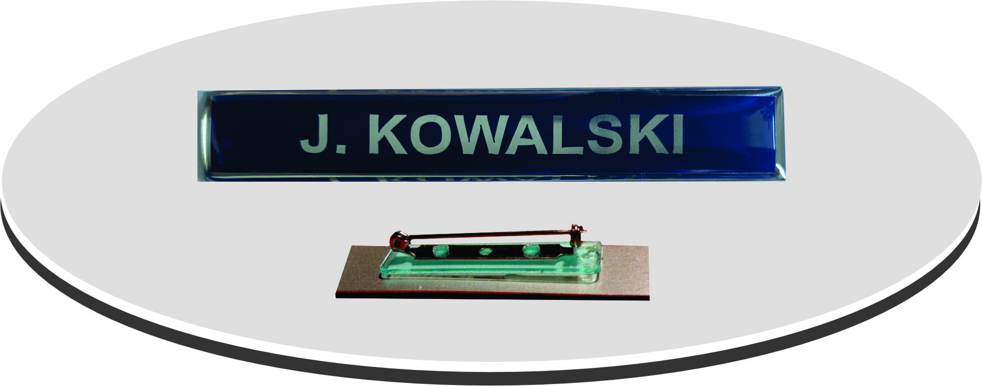 Identyfikator wykonany z folii naklejonej na srebrnej blasze aluminiowej o grubości 0,6 mm, pokryty warstwą żywicy poliuretanowej zapewniającej niepowtarzalny przestrzenny efekt. Wykonanie gwarantuje: